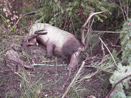 Then as I still waited to get a picture, another call came from an agent who was more local but still 100 miles away. He told me that if they darted an elk excited and exhausted like this one, the tranquilizer would probably be fatal. Before I finished giving him directions, I was glad to watch and describe to him the elk getting up, backing into the brush (so I couldn't get a picture, darn it), and running vigorously away through the woods. He was apparently now back to normal except for the cable decoration in his antlers.